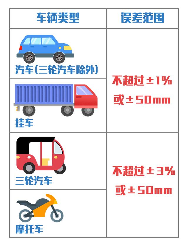 注冊登記安全檢驗時,機(jī)動車外廓尺寸實測值不應(yīng)超出GB7258、GB1589規(guī)定的限值,且與機(jī)動車產(chǎn)品公告,機(jī)動車出廠合格證記載的數(shù)值相比,誤差應(yīng)滿足: